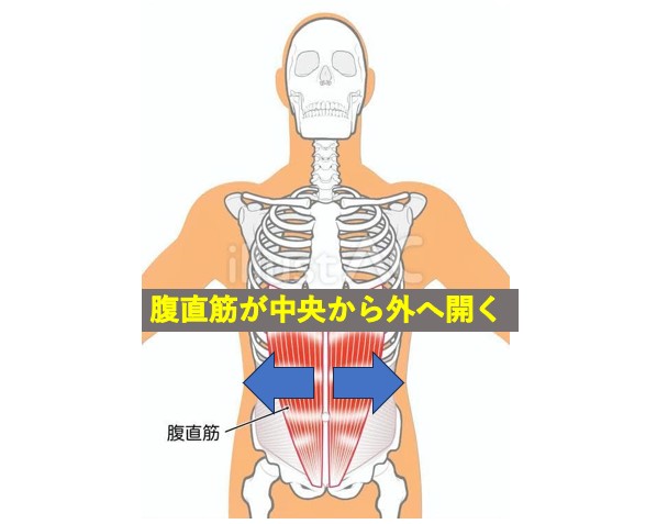 医療用語でこのように腹直筋が外へ伸びてしまっている状態を腹直筋離開といいます。